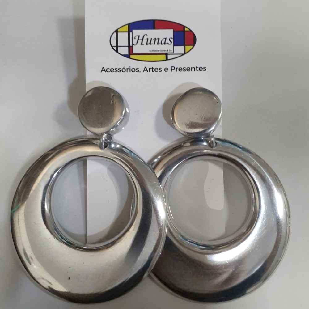 Brinco no formato redondo feito de alumínio, um material antioxidante, hipoalergênico e fácil de limpar.